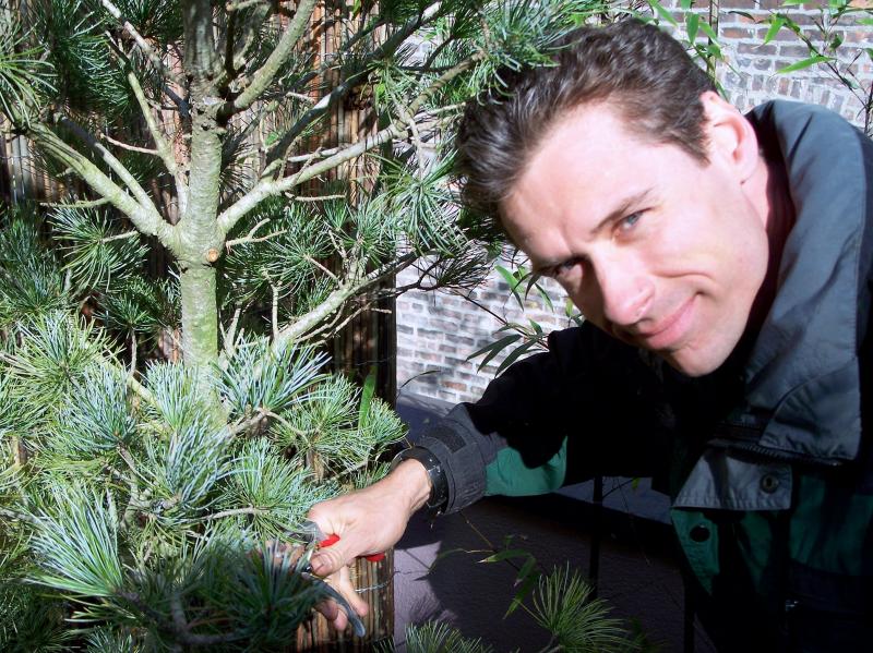 Bob Redman hand pruning a Japanese White Pine on a roof terrace.